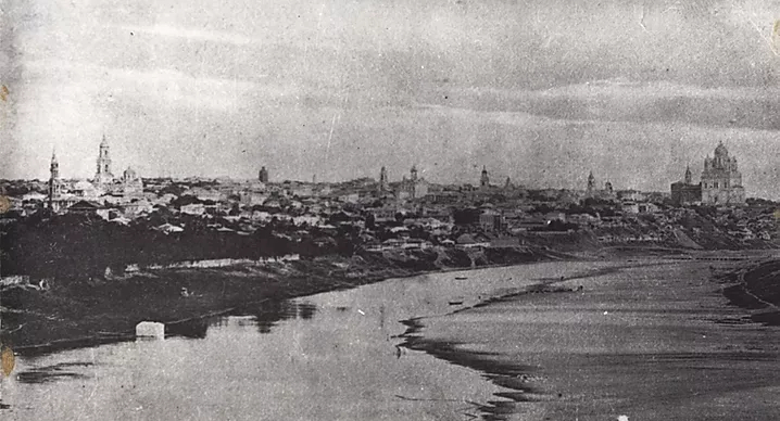 «...Я шел по той черной слободе, что спускалась от Щепной площади к кожевенным заводам, перешел по горбатому, от древности полуразрушенному каменному мосту через зловонный речной проток, заваленный гниющими в нем бурыми шкурами, поднялся на противоположную гору к женскому монастырю, – он так и сиял против солнца меловой белизной своих стен, а из калитки его ворот выходила молоденькая монашка в грубых башмаках, в грубых черных одеждах, но такой тонкой, чистой, древнерусской иконописной красоты, что я, пораженный, даже остановился...» «Жизнь Арсеньева» И.А. Бунин.